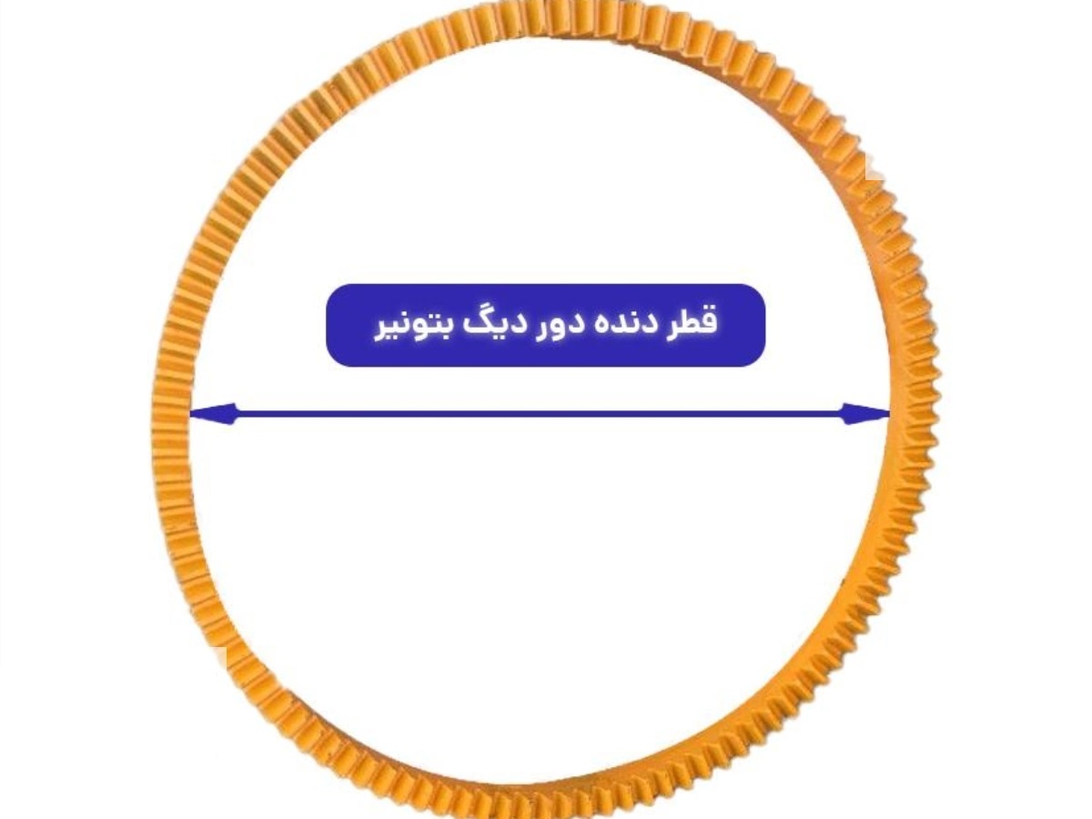 دنده دور دیگ بتونیر (یا چرخدنده بزرگ محیطی) یکی از حیاتیترین قطعات مکانیکی در میکسرها و بتونیرهای صنعتی و نیمهصنعتی است. این قطعه به صورت حلقهای و در پیرامون محیط خارجی دیگ بتونیر نصب میشود. وظیفه اصلی آن، دریافت نیروی چرخشی (گشتاور) از موتور اصلی است که معمولاً توسط یک چرخدنده کوچکتر (پینون) منتقل میشود.