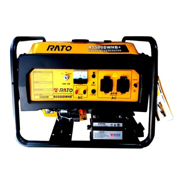 موتور برق استارتی راتو 3000 وات مدل R5500WHB+R توانسته ساختار و کیفیت بسیار بالایی را در بازار به خود اختصاص دهد. این محصول در ابعاد 49*44*55 سانتیمتر و دارای وزن حدود 50 کیلوگرم را دارد. خوب است بدانید که سوخت مصرفی این دستگاه بنزین است. محصول فوق روی شاسی بسیار مقاوم سوار شده و استارت ان به صورت دستی و الکتریکی است. لازم به ذکر است که ظرفیت مخزن سوخت این موتور برق حدود 16 لیتر و حجم موتور آن 212 سی سی است. از ویژگی های بارز این محصول میتوان به ولتاژ خروجی 220 ولت، ولتاژ خروجی 12 ولت و شدت جریان خروجی حدود 8.3 آمپر برای خروجی DC و حدود 13.6 آمپر برای خروجی AC اشاره کرد. محصول فوق تکفاز بوده و دارای دو خروجی AC است.