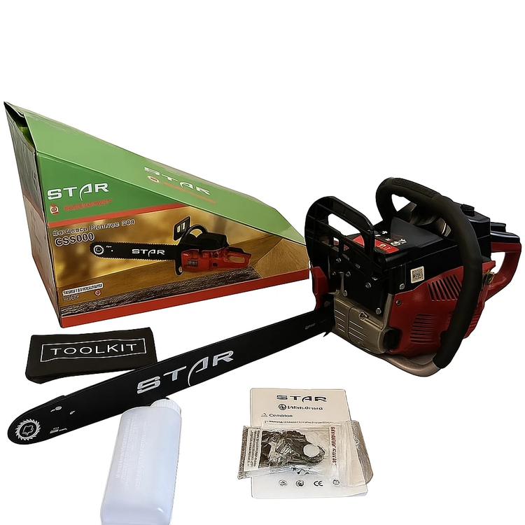 در بخش ایمنی، اره موتوری استار مجهز به ترمز زنجیر سریع و محافظ دست میباشد تا در صورت بروز فشار ناگهانی یا گیر کردن زنجیر، از آسیب احتمالی جلوگیری شود. این ویژگیها در کنار کیفیت ساخت بالا و قطعات مستحکم، این محصول را به ابزاری مطمئن و بادوام تبدیل کرده است.
